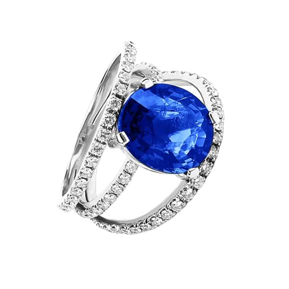 Pierścionek z szafirem i brylantami na szerokiej dwukolorowej obrączce
