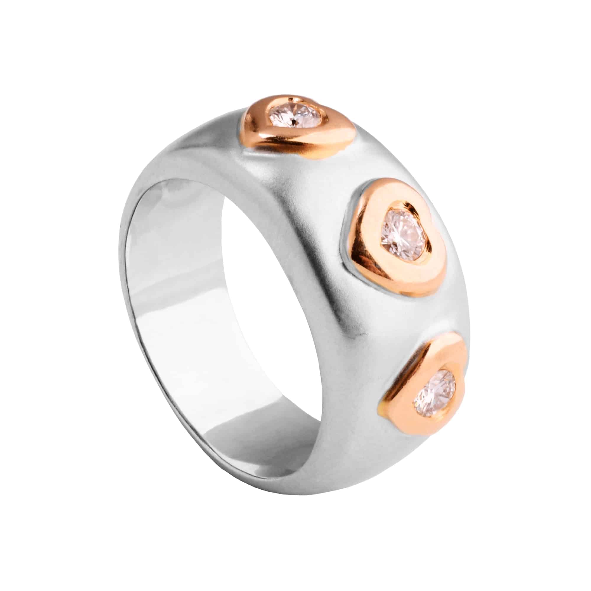 Pierścień obrączkowy wykonany w białym oraz różowym złocie z zakutymi na gładko brylantami w formach z motywem serca.