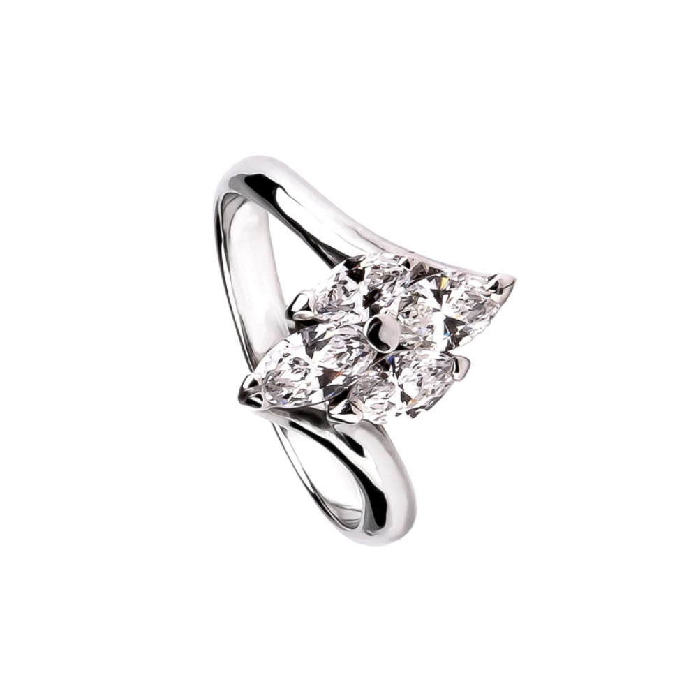 Pierścionek wykonany z białego złota z szykownie wykonaną oprawą czterech brylantowych markiz. Całość nowocześnie dopełnia asymetrzyczna forma obrączki.