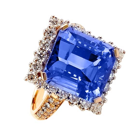 Pierścionek wykony w żółtym złocie z centralnie oprawionym tanzanitem którego kształt podkreśla prostokątna galeryjka. Całość została zwieńczona obrączką częściowo wysadzaną podwójnym rzędem brylantów.