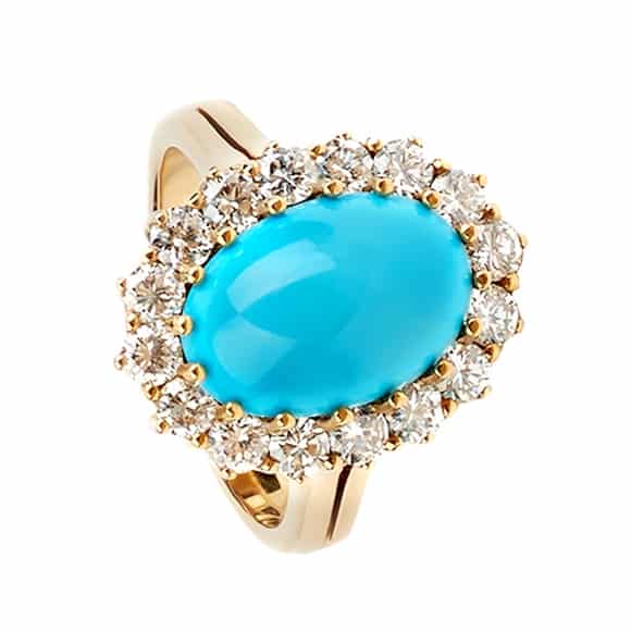 Pierścionek wykonany w żółtym złocie z centralnie oprawionym turkusem oraz brylantami w formie eleganckiej galeryjki wykonanej z klasycznych brylantów.