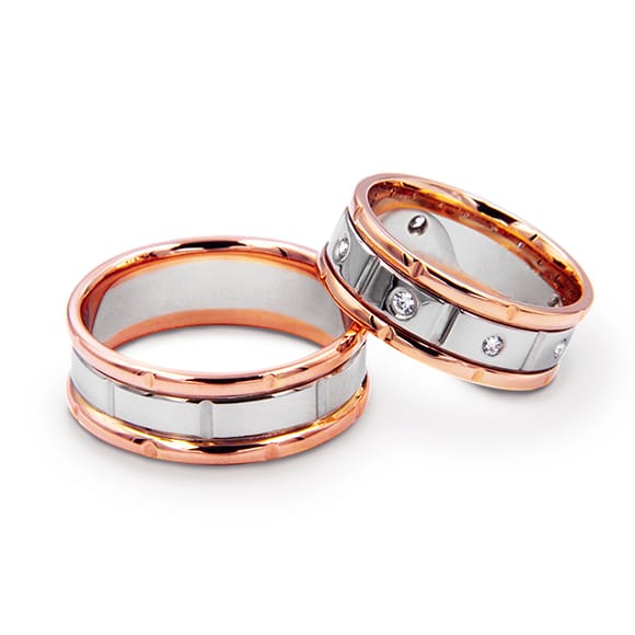 Nowoczesne obrączki wykonane z białego i różowego złota, ozdobione subtelnymi diamentami osadzonymi w centralnej części. Gładka, geometryczna forma nadaje im eleganckiego i wyrazistego charakteru.