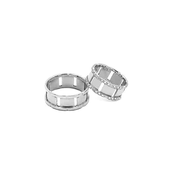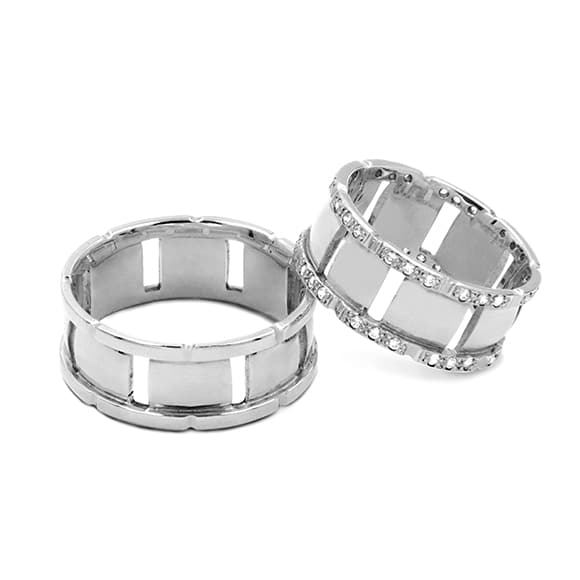 Nowoczesne obrączki wykonane z białego złota z wyjątkowym wzorem i subtelnymi diamentami. Wycięte elementy nadają im oryginalnego charakteru, tworząc efektowną, przestrzenną formę.