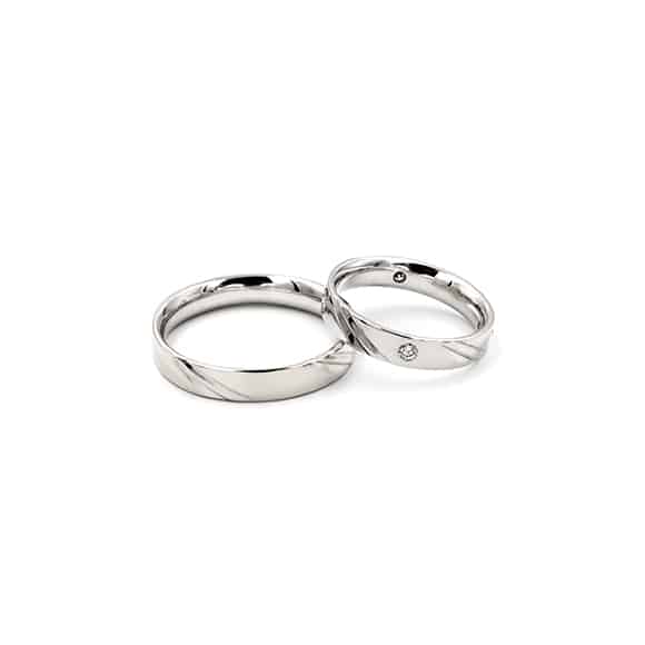 Klasyczne obrączki wykonane z białego złota o gładkiej, ponadczasowej formie. Wzbogacone o delikatny grawer oraz diamenty.